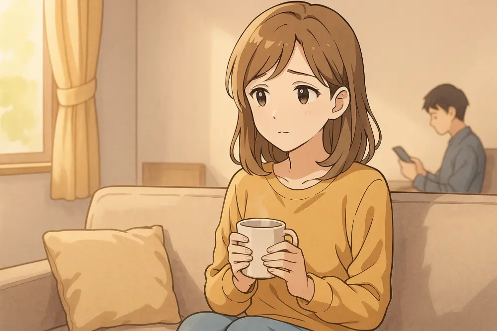 人に興味がない夫との夫婦の過ごし方を描いたイラスト。妻はドラマを楽しみ、夫はスマホを操作してマイペースに過ごす穏やかな日常シーン